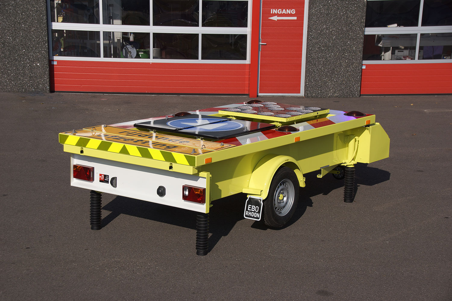 The frame and jacks of the traffic warning trailer are hydraulically operated, which decreases the set-up time of the trailer when arriving at roadworks and calamities. The hydraulic actions are carried out from the vehicle using a joystick or radio-controlled remote, which increases the safety during the road cordon.
