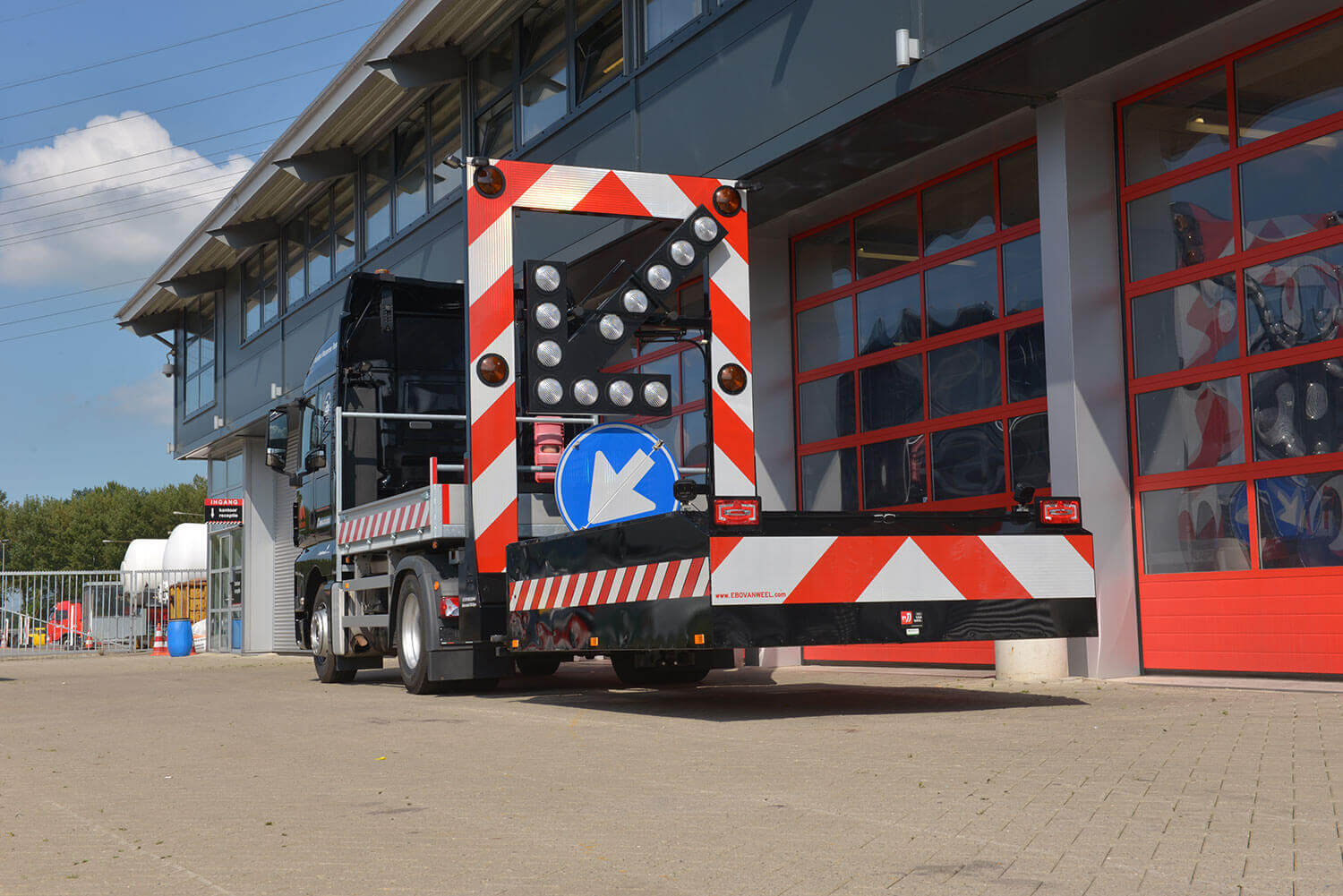- Aanrijbeveiliging welke aangesloten is op het remsysteem van de vrachtwagen. Bij aanrijding wordt de parkeerrem geactiveerd.